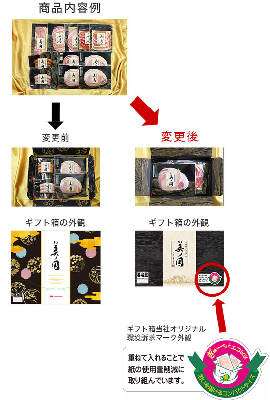 当社は未来に向けて取り組むマテリアリティ(重要課題)の一つ「持続可能な地球環境への貢献」を掲げて、『環境配慮型資材(再生素材やバイオマス素材など)の使用や包装資材等の使用量削減』を取り組んでいます。その取り組みの一環として、今中元期より環境に配慮したギフト箱を開発しました。従来はハム等の商品を並べて箱詰めしていましたが、重ねて入れることで、ギフト箱のサイズを小さくすることに加えて、これまで箱の内側に使用していた仕切りをなくしました。これにより、紙の使用量を約40%削減します。(※2)