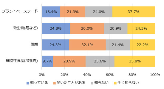 認知(知っている、聞いたことがある)は、プラントベースフードと細胞性食品(培養肉)は4割弱、 微生物(麹など)と藻類は5~6割