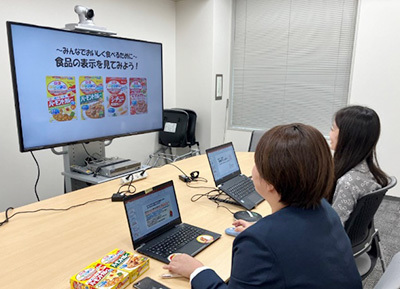 45分の授業では、食物アレルギーに関するクイズに答えてもらったり、食物アレルギー配慮商品の表示の見方を学ぶワークに取り組んでもらったりするなどし、終始積極的に授業に参加いただきました。