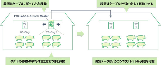 本装置は、豚舎に設置したケーブル上を3Dカメラが巡回し、撮影した画像から一頭一頭の豚の体重を人工知能(AI)が推論することで、その群れの体重分布と平均体重を算出します。装置はケーブルから取り外して別の場所に設置されたケーブルに再装着できることから、複数の区画の豚の群れも「PIG LABO® Growth Master」1台の付け替えで体重推定が可能です。また、ケーブルに電子タグを装着することで、その位置ごとに豚の群れの体重が算出される仕様となっています。算出された体重分布と平均体重は、装置本体の画面上のほか、離れた場所からもパソコンやタブレット端末から確認が可能です。