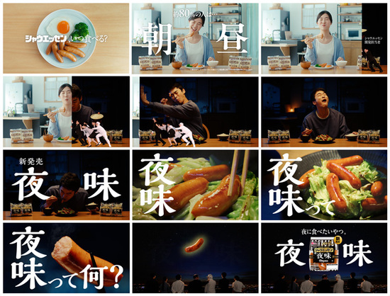 「シャウエッセン、いつ食べる?」という問いかけからCMは始まります。女性がシャウエッセンをおいしく頬張る朝食風景に合わせて、「約80%が朝昼」という調査データが出現。この事実に対して「夜も食べてほしい…」と切実な思いを抱くシャウエッセン開発担当者たちが、「夜の方も…よろしくお願いします!」の掛け声とともに、朝食画面を押し出していくと…夜ご飯に「シャウエッセン 夜味」のメニューをバクバクと口に運び、そのおいしさを味わう満足気な表情の男性が登場します。さらにキャベツと「シャウエッセン 夜味」がジューシーに焼かれる様子が食欲を刺激する中、「夜味って何?」と好奇心をくすぐるキーワードが登場。ラストシーンでは、三日月に見立て夜空に浮かぶ「シャウエッセン 夜味」を、開発担当者たちが見上げて想いを馳せながら、新商品のパッケージと「夜に食べたいやつ。」というコピーで締めくくるCMとなっています。