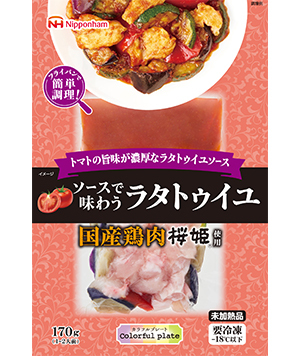 | 特長 | 国産鶏肉 桜姫®使用。 揚げなす、ズッキーニ、パプリカで彩りよく仕上げました。 トマトペースト、あらごしトマトにおろしにんにくを加えたラタトゥイユソースは、トマトの旨味が濃厚です。 |
