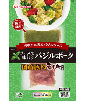 | 特長 | 国産豚肉 麦小町®使用。 ブロッコリー、パプリカで彩りよく仕上げました。 バジルソースが爽やかに香ります。 |