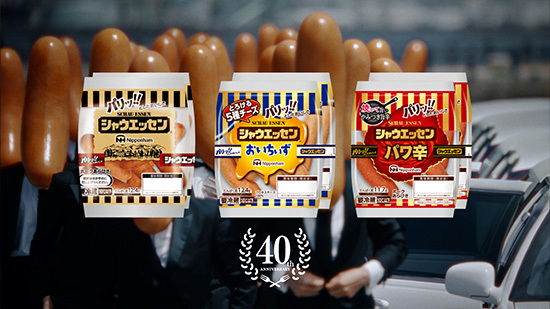 ずらりと並んだ車から、颯爽と登場するシャウエッセンの姿をしたシャウマン。スーツに身を包み、バシッと決めたその姿はまるでヒーローのよう。次から次へととぎれることなく、新しいシャウマンが登場していきます。一体、彼らは何なのか。どこへ向かうのか。すべてが謎につつまれたまま、「新しいシャウ、ぞくぞく。」のコピーが入ります。そして、定番のシャウエッセンのパッケージから、派生するように新商品のシャウエッセンのパッケージがぞくぞくと登場し、40周年のロゴが入ります。場面が変わると、そこではたくさんのシャウマンが、子どもたちにシャウエッセンを届けていて、一口食べた少年は、そのおいしさに恍惚の表情を浮かべます。