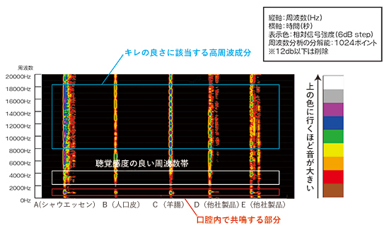 シャウエッセンの「パリッ‼」音は、瞬間的に破断する時の音(キレの良さ)に該当する「高周波数帯」、線の太さ(音の発生頻度)、色の分布(音の強度)のいずれにおいても、比較対象内で最も存在感のある結果でした。