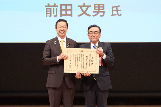 (表彰式の様子:(左から)黄川田仁志 内閣府特命担当大臣、日本ハム 取締役副社長 前田文男)