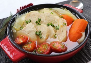 鶏肉(タイ又は日本)、植物油、鶏皮、大豆たん白、卵白液、食塩、白湯スープ、しょうが、香辛料、酒、ゼラチン、バジルペースト、小麦たん白、酵母エキス調味料、醸造酢、脱脂粉乳/調味料(有機酸等)、リン酸塩(Na)、増粘多糖類、香辛料抽出物、(一部に卵・乳成分・小麦・大豆・鶏肉・豚肉・ゼラチンを含む) |
