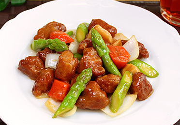 火が通ったら酢豚の「ソース」を入れ強火で約1分炒めて、お皿に盛り付ける。
