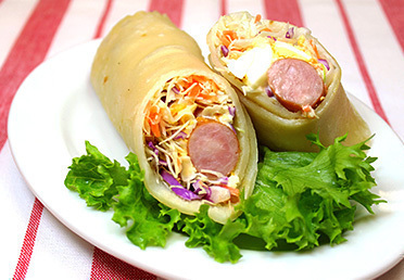 その上に、ブロッコリースプラウト、シャウエッセン、ブロッコリー、にんじん、角切り赤パプリカをバランスよくのせ、花束のような形に包む。