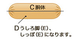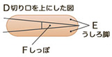 D(胴体)を切り口を上にして図のように3等分し、E(うしろ脚)、F(しっぽ)に切り分けます。