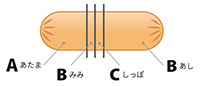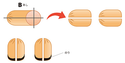 B(みみ)C(しっぽ)は半分に切っておきます。