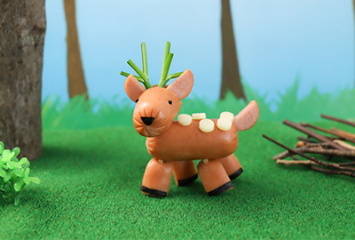 しっぽの位置にタテに切り込みを入れ、C(しっぽ)を差し込みます。チーズをストローで切り抜き、E(からだ)にシカの模様をつけて出来上がりです。