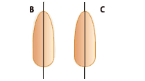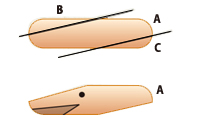 Aウインナーの両端を斜めに切ります(B,C)。更にAウインナー右下部分にVの字に切りとり口を作ります。Vの字の延長線上にゴマで目を作ります。