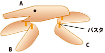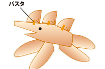 Aウインナーの下にB,Cウインナーの足をパスタで付けます。