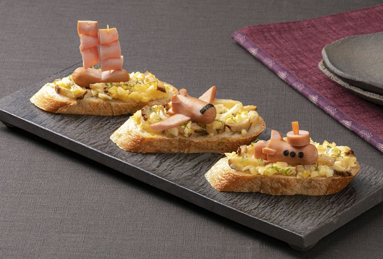 バゲットを1cmの厚さにスライスしてタマゴサラダをのせ、乗り物の飾り切りをトッピングして出来上がり。