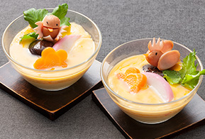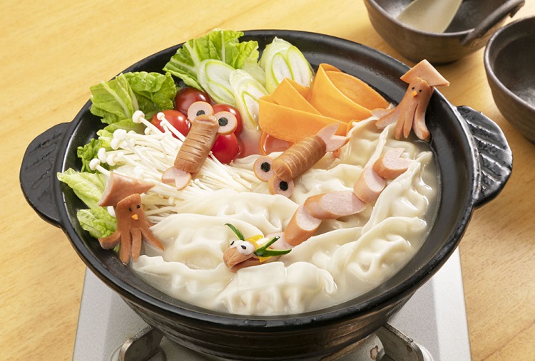 鶏がらスープで野菜を煮て火が通ったら水餃子と飾り切りのイカ、うなぎ、龍を入れ、ひと煮立ちしたら出来上がり。ぽん酢やお好みのタレでお召し上がり下さい。