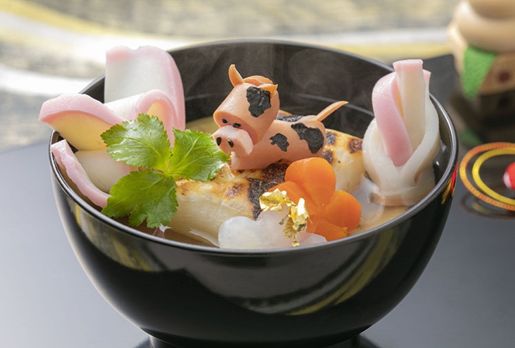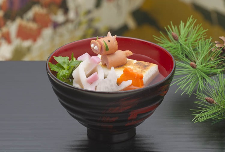 飾り切りした辰は、お雑煮の具材の上に配置します。辰の目はチーズと黒ごま、角はきゅうりで作りました。