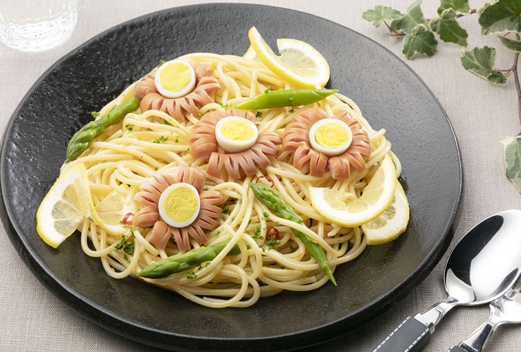 いつものパスタに飾り切りをのせてボリュームアップ。
