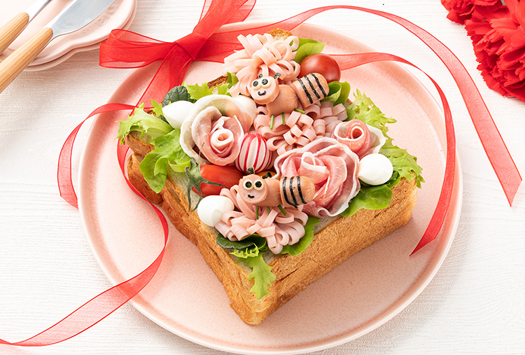 食パンをくりぬいて、そこにたっぷりの野菜と生ハムやロースハムで作った花を盛り付けました。おやっ!お花にミツバチもやってきましたよ。