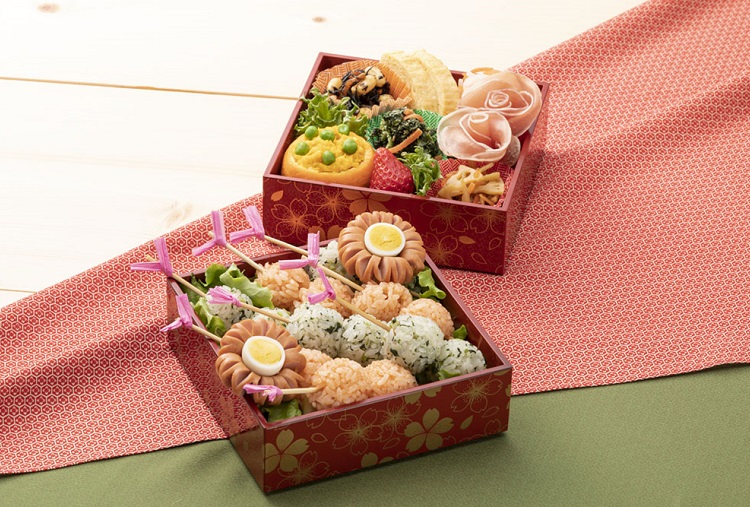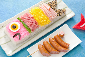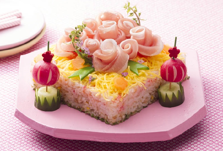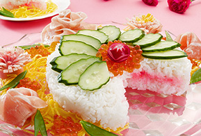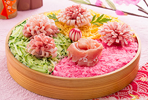 酢めし、ハム、でんぶ、キューリを交互に重ね、おし寿司を作ります。トッピングにハムの飾り切り「バラ」「菊」「たんぽぽ」を飾ります。