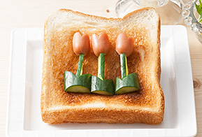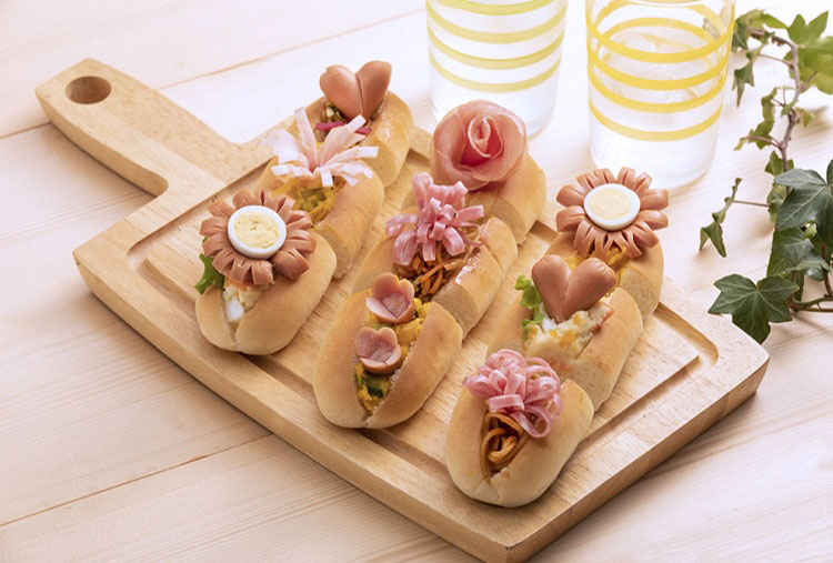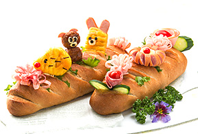 飾り切りハム(タンポポ、菊)チキンナゲット、ミートボールクマさんをバケットにはさんで、朝から元気に!