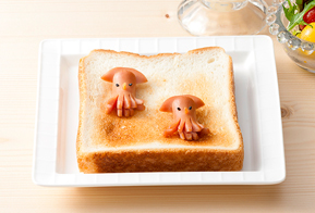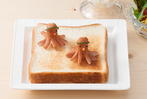 飾り切りウインナーの片側を8等分にし1~2分ボイルし足をひろげます。ひと口サイズのパンに差しこみケチャップで目、口をつけます♪