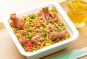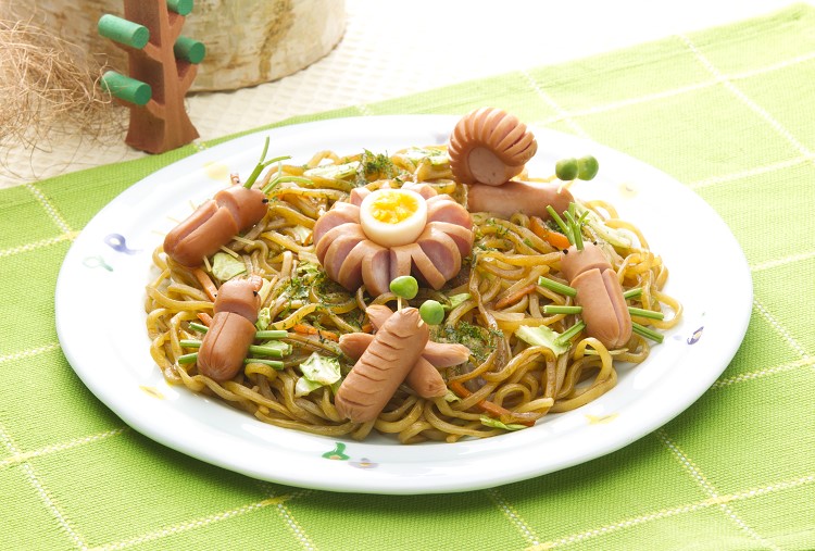 いつもの焼きそばに飾り切りを盛り付けるだけで、楽しさ満点。