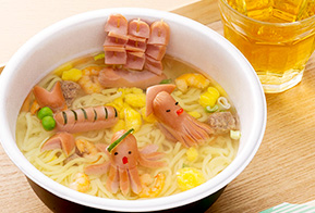 インスタントカップ麺を用意し飾り切りは事前に切り込みをいれて、お湯をそそぐと綺麗に広がります。