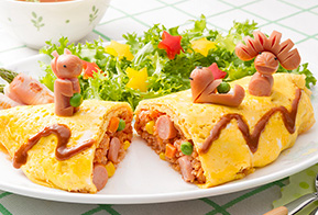 オムライスには輪切りにしたウインナーを入れグリンピースを持った動物達をトッピングしよう。