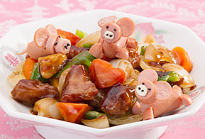にんじんの短冊切りカニカマを手でほぐし、甘酢のタレで加熱し卵をとぎ入れ、半熟状になるまで加熱します。グリンピースと飾り切りのヒヨコをのせ出来上がり!