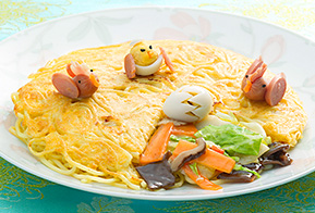 八宝菜の上に、固焼きそばをのせ飾り切りの小鳥、ひよこを、トッピング。