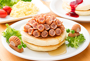 ミニアメリカンドックはウイニーにホットケーキ用の衣をつけ揚げて下さい。鮮やかなハムの飾り切りを添え子供が大好きなものばかりがのったカラフルで可愛いワンプレートの出来上がり。