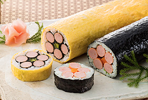 作りやすくて食べやすいミニ恵方巻です。ウイニーを5本巻いてお花の形に出来上がり、子供さんにも喜ばれます。