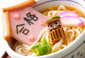 うどんの上にハムとウインナーで作った「合格祈願札」、フランクに海苔とチーズで型切りして顔を作ったダルマをトッピング。