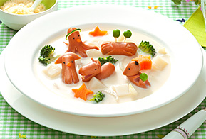 きりたんぽの先に飾り切りの動物達やチューリップを差し込んで煮込んで下さい。