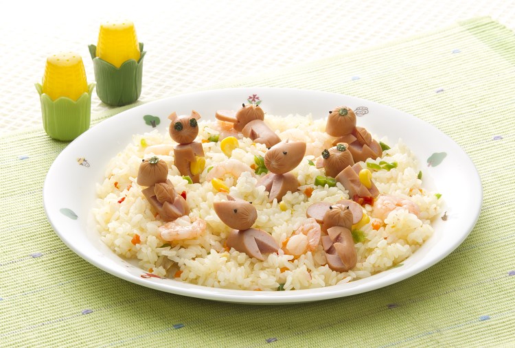 ピラフの上に飾り切りを乗せるだけで楽しさ倍増です。
