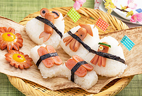 飾り切りのタコ、イカ、ウナギは1分ボイルしてから塩おにぎりに、のりでとめて下さい。