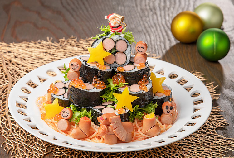 太巻き寿司をツリーに見立て、飾り切りのトナカイ、雪だるま、長靴をトッピング♪