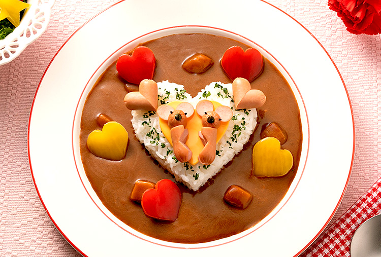 母の日のカレーには、ハートのご飯の上にハートのウインナーと飾り切りのコアラの親子をトッピング!