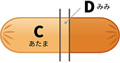 2本目のウインナーを半分に切り、C(あたま)とD(みみ)を1枚切り出します。
