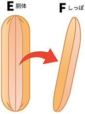 3本目のウインナーの中央部分にV字の切り込みを入れ、E(胴体)、F(しっぽ)を切り出します。