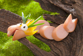 A(頭)に目(白身卵にゴマ)をつけキュウリとパプリカで角と首回りを表現します。1で切ったB(胴体)を、ずらしながら並べC(尾)を最後に並べ龍の出来上がり。