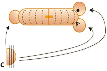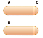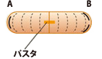 1で切った両端をパスタでつなぎ合わせ、点線のようにウインナー全体に2mmほど8ヶ所、切り込みをいれ、Aの部分に真横に5mm切り込み、Bの部分に真横から切り込みを2ヶ所入れる。