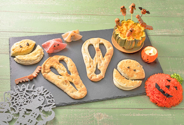 ナンとパンケーキのハロウィンプレートです。超うす切りハムにカボチャサラダを包み四方を押さえれば、「おばけ」の出来上がり!