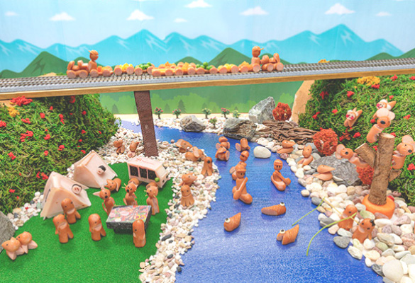 夏の暑い日!陸橋には、汽車が荷物を運んでいます。飾り切りの仲間達は川遊びやキャンプでのバーベキューを楽しんでいます。