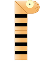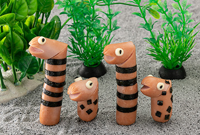 チンアナゴの縞模様になる海苔(長さ5cm、幅3mm程度)5本を用意します。1枚ずつ水に浸しながら胴体に巻いていきます。スライスチーズと黒ゴマで作った目玉をつけて出来上がりです。