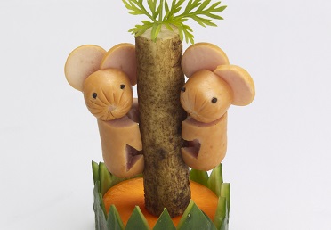 頭に切れ目をいれ、耳をはさんで黒ごまで目をつけます。