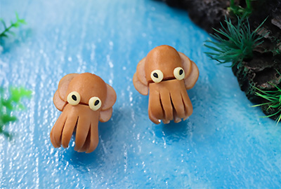 ウイニーで作ったコウイカが気持ちよさそうに泳いでるよ!つり目気味につけた黒ごまの目がポイントです。