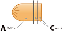 A(あたま)からうす切りを2枚C(みみ)を切り出します。