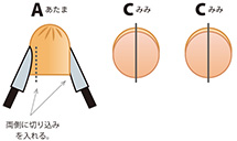 A(あたま)の両側にC(みみ)を挟むため5mmほどの切り込みを入れます。C(みみ)2枚を半分に切ります。